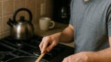 フライパンで鶏肉を焼く音、卵の香り、湯気の立つご飯。