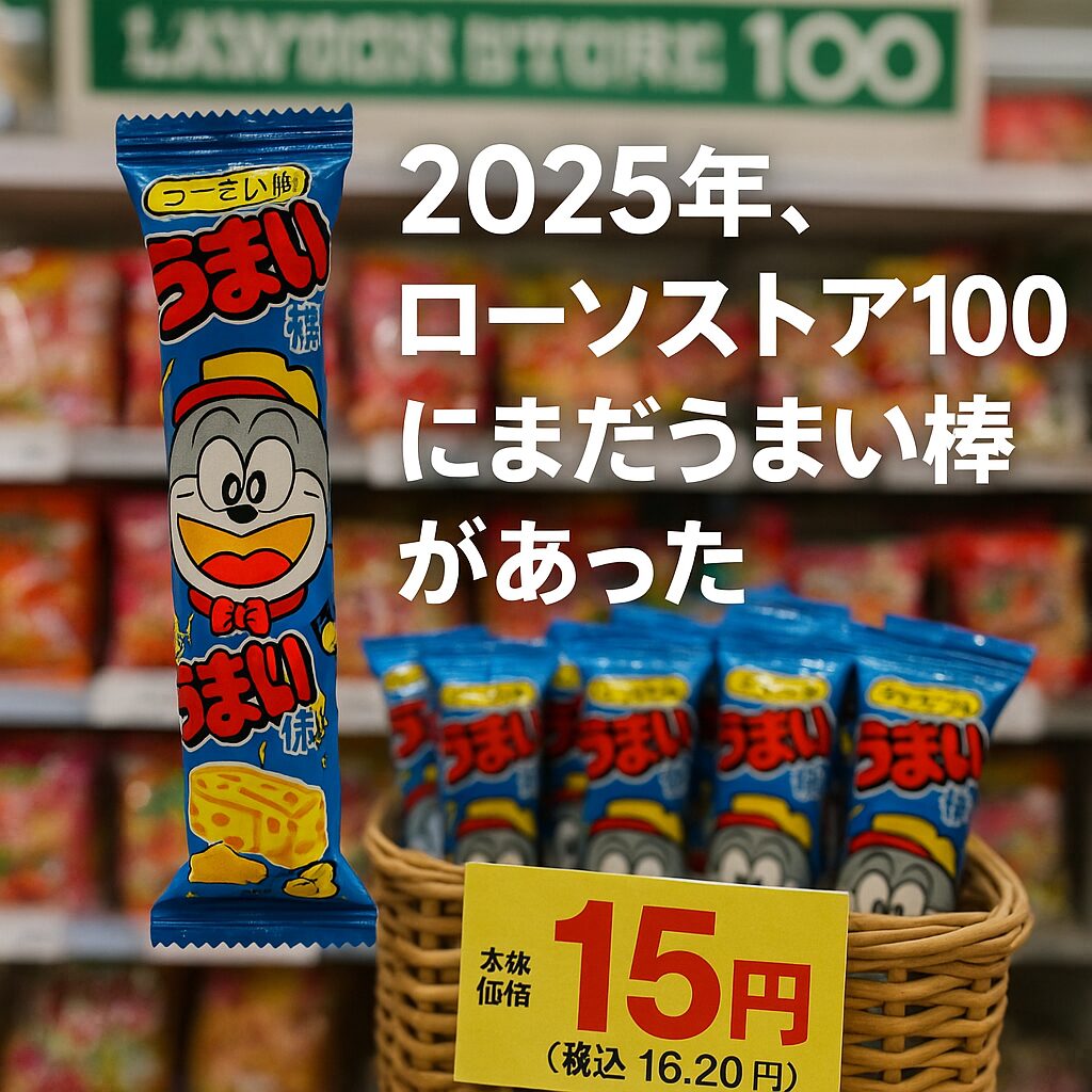 2025年のある日、仕事の帰りにふらっと立ち寄ったローソンストア100。物価高だ、チョコもスナックも値上げ続きのこの時代に、ふと駄菓子コーナーを覗いたら――目に入ったのは、あの懐かしい「うまい棒」。しかも値札は15円(税込にしてもワンコイン以下)。思わず二度見した。